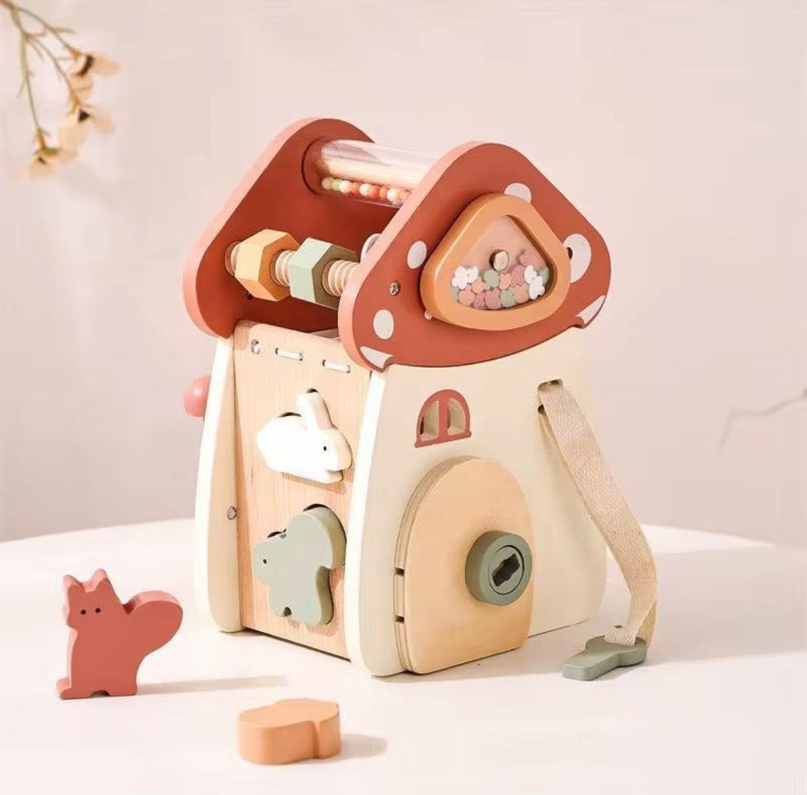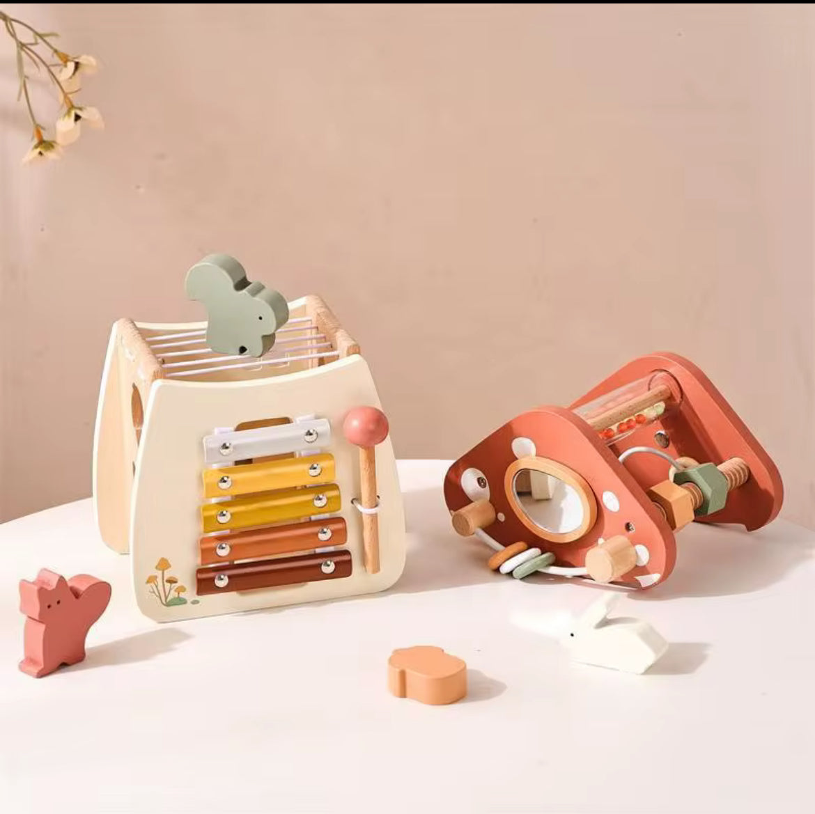 Aktivitetskub: Flera sidor med olika aktiviteter, som en xylofon, snurrande kugghjul, formsorterare och kulbana. Det naturliga träet och de dämpade, jordnära färgerna ger en lugnande estetik.
