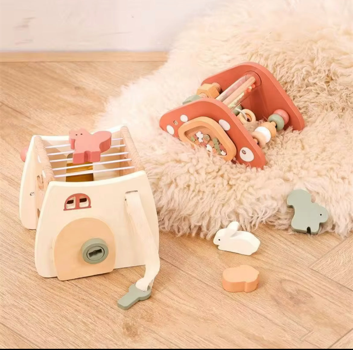 Det här är en vackert designad, Montessori-inspirerad träaktivitetskub och leksaksset. Det innehåller olika interaktiva element för att uppmuntra sinnesutforskning, finmotorik och problemlösning. Setet inkluderar: